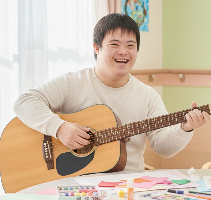 僕はダウン症ですが、今、ギターをやりたいと思っています。だけど自分一人では難しくてできなくて、ARUAIYUで練習しています。上手くなったらプロになりたいと思っています。